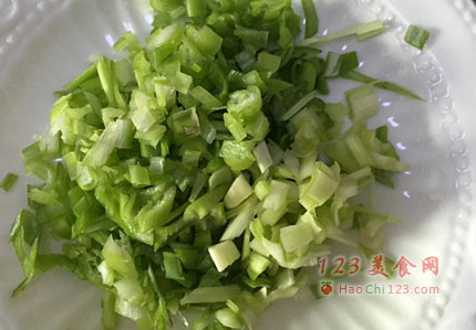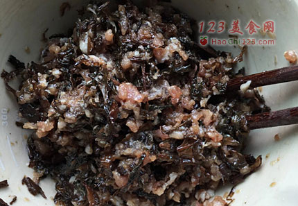 3、炒好放凉的梅干菜与剁好的肉一起加入白糖、芝麻油、料、盐和胡椒末拌匀。