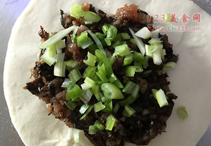 5、醒好的面团分成8等份,大概每份的面团45克左右,也可以做更大一些。面擀成好面片。加入梅干菜猪肉馅并在上面撒个葱末。