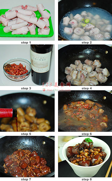 2、冷水入黄酒将猪尾焯水,洗净备用。