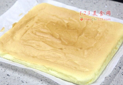 5、在铺了油纸的烤盘里倒入面糊,抹平。放入预热好上下火180℃的烤箱,烤13-15分钟,至蛋糕完全发起,表面金黄色。用牙签扎入蛋糕中心,拔出的牙签没有残留物,就说明烤熟了。将烤盘取出,提起油纸边缘将蛋糕从烤盘里取出来。撕去边缘的油纸,等待蛋糕冷却。
