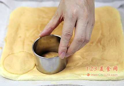 6、蛋糕冷却后,将蛋糕背面的油纸撕开。然后用直径4-6cm的圆形切模切出圆形的蛋糕片(根据你想制作的蛋糕大小,可以选择不同直径的切模)。