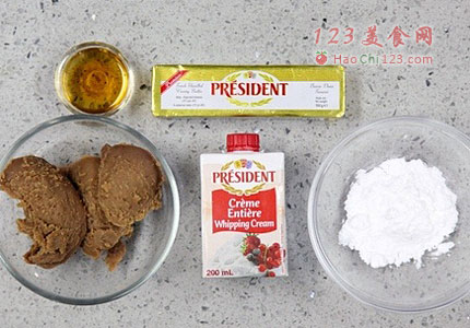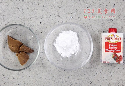 7、接下来就开始准备馅料了。首先制作奶油馅,配料:栗子泥50克,淡奶油150克,糖粉15克。