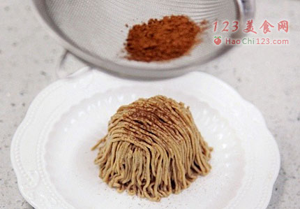 13、最后,将栗子馅以线条的方式满满的挤在蛋糕外围,创造出蒙布朗的经典造型(在裱花袋前端直接剪一个小孔,就可以挤出线条状的栗子馅,但这样比较费时,也可以用蒙布朗挤花嘴进行挤制)。在蛋糕表面撒少许可可粉(糖粉也可),并用水果或者一颗糖渍栗子放在表面作为装饰,蒙布朗蛋糕就做好了。