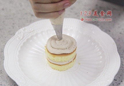 12、将奶油馅装入裱花袋(用小号圆孔裱花嘴),在一片蛋糕片上挤上一圈奶油馅,放上第二片蛋糕片。再挤上一圈奶油馅。