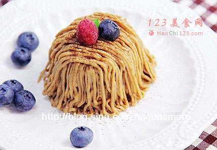 3、根据造型、挤制方法的不同,奶油馅和栗子泥的用量会不同。所以这个配方给出的分量,也许不能让你恰好将三种材料都用完。比如当你用线条的方式将栗子馅挤在蛋糕表面,如果挤得厚一些,栗子泥可能会不够。不过栗子泥的制作很方便,如果不够用的话马上再多做一点就好了。