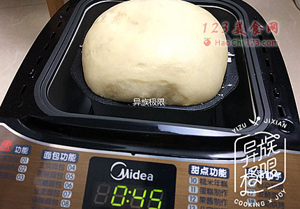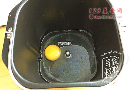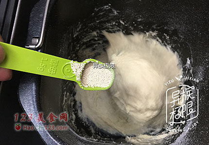 4、液体与粉末柔和后加入酵母,机器继续搅拌,听到蜂鸣声时加入软化的黄油。