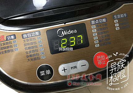 3、面包桶放入面包机里;选择菜单键“甜味面包”功能,显示屏显示所选程序和时间并交替闪烁。