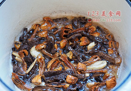 2、菌菇提前清洗二遍,第三遍泡菌菇的水就能用,因为香味都在这里。