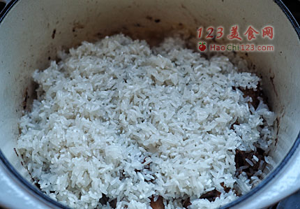 3、本道米饭我用的是铸铁锅。如果没有铸铁锅的同学,就把炒米和菌菇的过程放炒锅完成,再转入电饭煲,加菌菇水,完成煲饭过程。[LaoYanHuo.com]