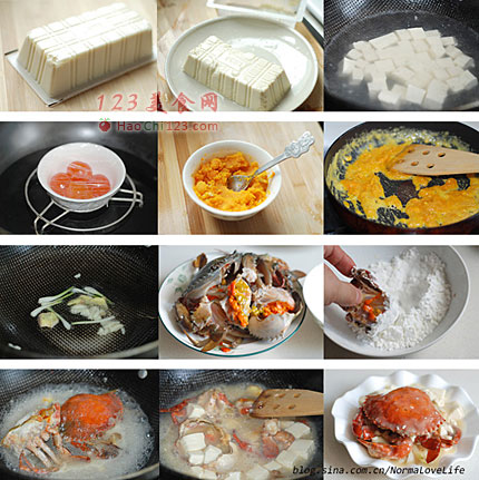 9、在切面上粘少许淀粉,可以防止煸炒时蟹黄流出。