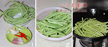 3、锅内多倒些油烧热后,下入豇豆,小火煸炒。