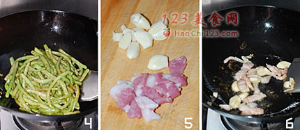 6、起油锅,入蒜头和五花肉炒香(喜辣的可以把辣椒加入煸炒)。