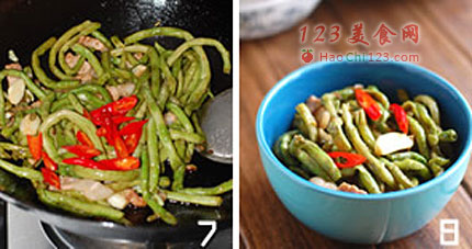 4、豇豆煸炒至软烂后盛出备用(这个过程比较长,一定要小火不断翻炒)。