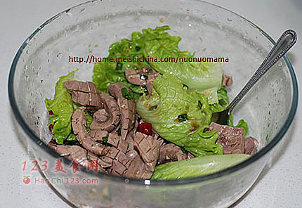 9、将腰花捞出沥水,和生菜、味汁一起拌匀即可。