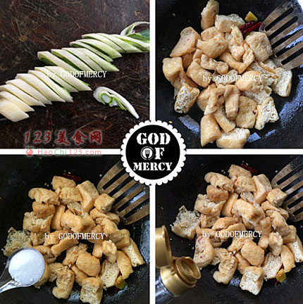 3、当油温时;沿着锅边下豆腐块,以免油花四溅。用小火煎炸。豆腐炸成硬块时;才能缓缓翻动。[LaoYanHuo.com]