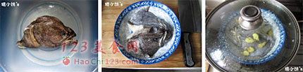 3、蒸锅水开后,放入鱼初蒸3分钟后,取出立即倒干净蒸出来的比较腥的水。
