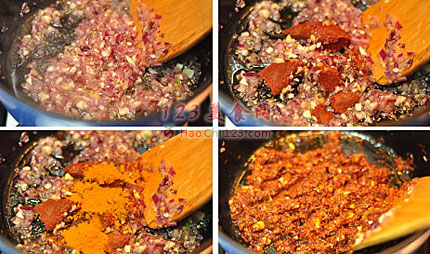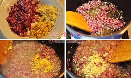 3、再加入姜末,炒匀后加入蒜蓉,继续小火煸炒。把香料水分煸干,有耐心的可以比我图中状态再多炒一会儿,炒到微黄。
