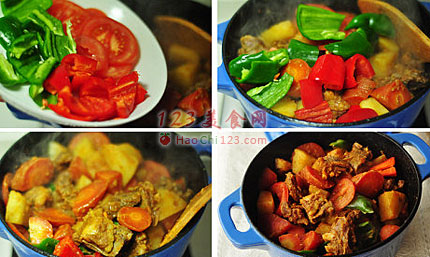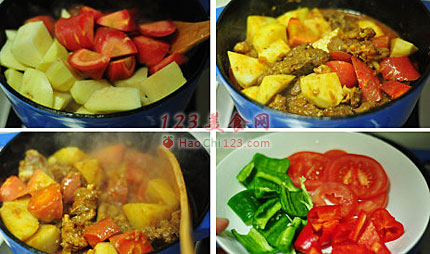 8、焖到土豆酥软,中途可切少量的青红椒、番茄片备用。