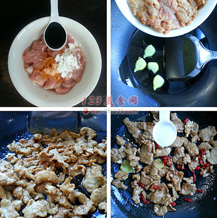 6、油热后下肉片滑散。肉片炒到划散变色4成熟时捞出沥干油。