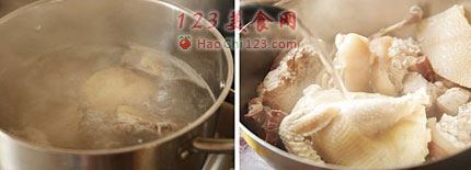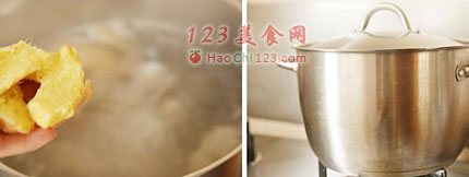 4、烹入酒料、白胡椒粒和姜块,转中小火吊6-8小时(锅内保持微沸状态煮出来的是奶汤,若微火慢煲即为清汤)。