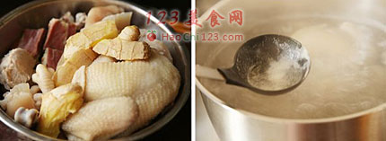 1、发制好的食材(海参、鲍鱼、鱼翅、花胶、火腿)用放了大量葱、姜、料酒的锅里焯一下水;把所有的材料放入炖盅内(如果用的是活鲍,蒸好后再放进去复蒸10分钟),浇上浓高汤。