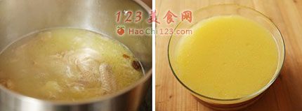 5、放入黄枝子再吊15分钟左右高汤就吊好了,过滤去汤渣,即为浓高汤也叫奶汤。
