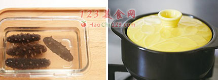 1、发海参。干刺参与纯净水一起放入容器中,浸泡24小时,其间8小时换一次水。浸泡好的海参顺切口方向剪开腹部,去除沙嘴并将内壁上的白筋剪断,然后清洗干净,放入砂锅中中火煮开后关火放至自然凉却,重复煮开一次再放凉,移入装有纯净水和冰块的容器中,冰箱冷藏2-3天,其间8小时左右换一次水。海参就发好了(切记,发海参一定不能见油,建议用纯净水来泡不然泡发过程中容易坏)。