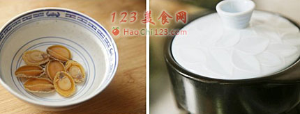 2、发鲍鱼。鲍鱼用清水浸泡一天,放在装有高汤、料酒的小碗内上锅小火焖煮或蒸30分钟(不要用金属锅,不然鲍鱼会发黑哦)。焖鲍鱼的时候请一定用小火,如果你最小的火头也大的话要把灶上的支架垫高一些,因为很容易烧糊,最好在厨房看着,我就烧糊了一锅。如果是活鲍,洗净后即可烹制。