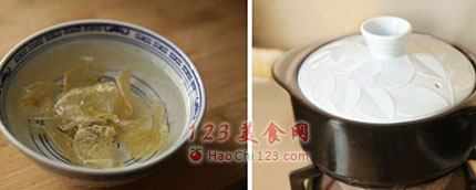 3、发花胶。花胶可油发也可水发,这里以水发为例,将洗干净的花胶用纯净水泡发一天,砂锅里注入水、葱、姜、料酒,上面放上竹篦子,放上花胶,烧开后关火保持盖盖状态焖至水凉,再烧开,再放凉,直至花胶软糯即为发好,如果花胶大的话烹制前改刀切成条。