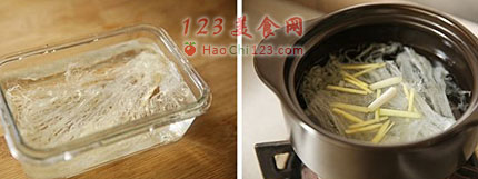 4、发鱼翅。鱼翅用纯净水泡一天,与葱、姜、料酒一同入锅慢火烧开即刻关火,焖至水凉,取出洗净即可。也可以放在竹篦上与少许肥肉一起蒸。