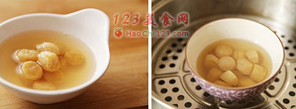 5、元贝。元贝清水洗净后放入小碗中,加料酒上锅蒸软即可,如果不介意海腥味直接用清水蒸也可以,这样能更多的保留元贝的原汁原味。