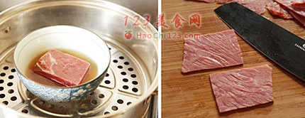 6、火腿与酒料一起入锅蒸软,改刀成小块,漏拍了一张切片的照片,用其它图代替,实际切得要小一些。