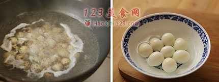 8、鹌鹑蛋,买不到鸽子蛋,用鹌鹑蛋代替了,洗净,煮熟后即刻过冷水,捞出在盆里晃一晃再颠一颠,剥去蛋壳即可。