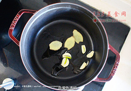 2、铸铁锅加热,放上少许色拉油,煸香蒜片和姜片。