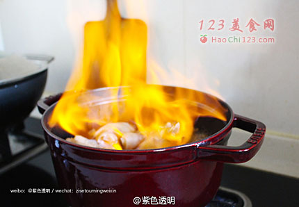 3、放入猪蹄翻炒煸香,烹入部分料酒,借助酒的挥发,二次去除肉腥。