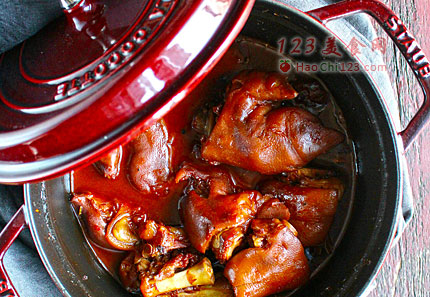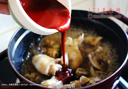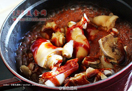 4、淋上南乳汁,给猪蹄上色并搅拌均匀。