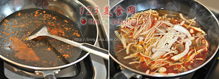 2、锅开之后,放入金针菇,蟹味菇,煮开锅。