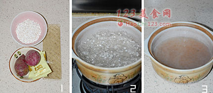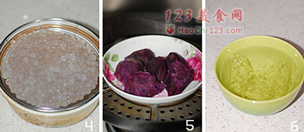 9、把紫薯汁和西米混合(椰子粉和紫薯都有甜度,根据实际情况调入蜂蜜或练乳。冰过以后甜度会降低,所以要调的甜一些)。