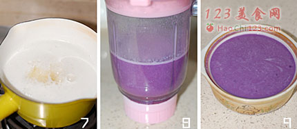 8、放凉后的紫薯和椰子汁入料理机打成细腻的紫薯汁。