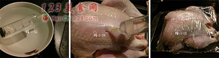 5、将盐水打入整鸡的不同部位。哦对图片上可以看到的那么多孔并不是我扎的,买来拆开就发现有莫名的这么多孔,我就正好顺着这些孔眼扎针了,我以前做烤鸡是喜欢像中式盐卤那样弄一大锅盐水浸泡整只鸡,第一次尝试这种打盐水的方法,边打边漏水啊,好在盐味依旧进去了,很入味。