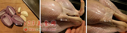 7、蒜3瓣去皮,洋葱1个去皮切成四等份,将蒜和洋葱,还有步骤3准备好的鸡脖和内脏都填入鸡肚子里,放洋葱和蒜我是想去腥增香,同时也为之后的酱汁增添香味,因为简易版的酱汁会缺这些味道,鸡脖纸这个东西歪果仁一般都是拿来做酱汁gravy哒(写完这句话总觉得哪里画风不太对,嗯我今天没吃药),就是跟洋葱胡萝卜什么的一起烤吧烤吧炖了当高汤使,增加点骨头和肉的香味,但是天朝人民表示这个东西我们爱吃,并不是非用来做酱汁不可。