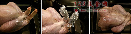 8、火鸡的造型,一般是如图示这样把鸡脚倒塞回鸡腹中。