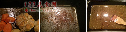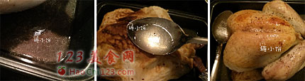 16、步骤15的淋汤汁具体操作如图示,烤盘里的汤汁除了加进去的清水外也混合了火鸡的油和肉汁。