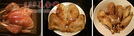 18、步骤15的160摄氏度40分钟结束后取出把表面的棉布去掉,同时我也去掉了步骤11包裹在脚踝上的锡纸,再进炉200度烤至表面上色,熟透(竹签扎没有血水即可)以后取出。