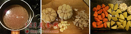 23、步骤20等那半个小时的时候正好准备配菜,我放了土豆胡萝卜和烤蒜,芹菜和洋葱也是很不错的选择,因为很适合给蘸酱Gravy调味,如图是整头的蒜,把外层的皮剥一剥,顶部切一刀。切下来的那些碎蒜瓣我留着之后炒菜了。