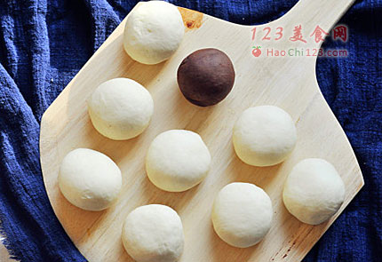 2、揉成非常光滑的面团;取20g面团加入可可粉揉成可可面团,其他面团均匀分成45-50g一个小面团揉均匀滚圆松弛15分钟。