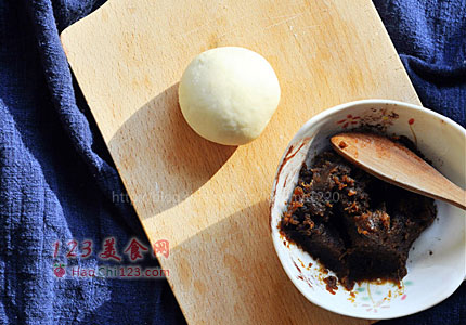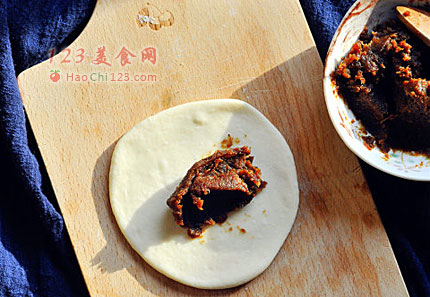 3、松弛好的面团擀成圆片;加入枣泥馅儿包成小圆包。