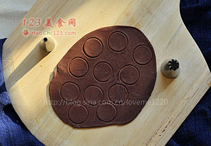 6、剩下面团擀成圆片用裱花嘴刻成圆形,在用擀面杖把圆形擀成椭圆,之后用小裱花嘴在椭圆刻一下,这个小圆做嘴巴。