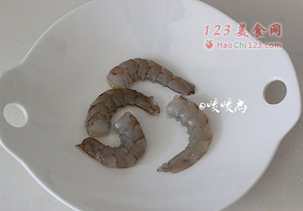 5、将打散的鸡蛋液过筛两次后分装进蒸蛋羹的小碗中,同时放三个虾仁在鸡蛋液里。
