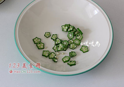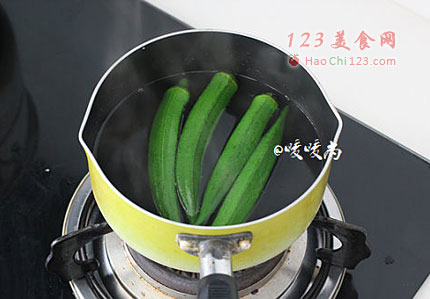 2、奶锅开一锅水,水开后加一点点盐(分量外),下洗净的秋葵焯水半分钟捞出冲凉。